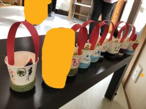 紙コップと毛糸を使い、鬼モチーフの飾りをみんなで作りました☆