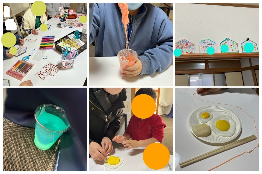 また、いつもとちょっと違う蓄光スライムというものも作ってみました。陽の光を当てた後、暗い場所で見てみるとぼんやりと光る姿に「見て!!」と大興奮。スタッフと一緒に色つきスライムで本物そっくりの目玉焼きを作ったり、ながーく伸ばしてスライムの道を作ったりといろいろな物を作って遊んでいました。
