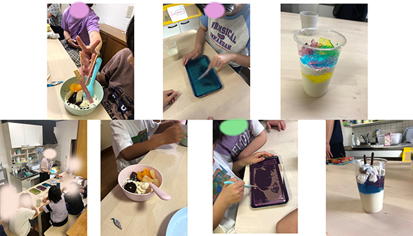 さらにそこからトッピング!!星やハートのマシュマロやホイップクリームにお菓子を追加してミニパフェのようなアジサイゼリーが出来あがりました!(完成)梅雨のジメジメが吹き飛ぶほどに楽しむことができました(やったあ)